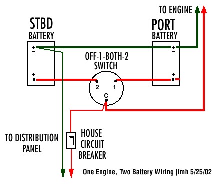 The critical thing to remember in this system is that you only have your battery switched to either battery one, or battery two at any one time. Sometimes people with this setup will mistakenly run their vessel with the battery switch in the 1+2 position (both batteries connected). When the battery switch is in this position, you effectively have only one battery. If you experience a fault with one battery, it can flatten or damage the other battery, rendering the whole purpose of a twin system useless.