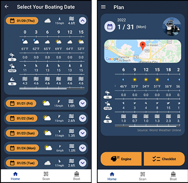 STEP 2Inspect Your Boat and Engines with ChecklistYou can plan your boating day, checking the conditions of the weather, wind and wave around your destination for 1 week. Checklist |